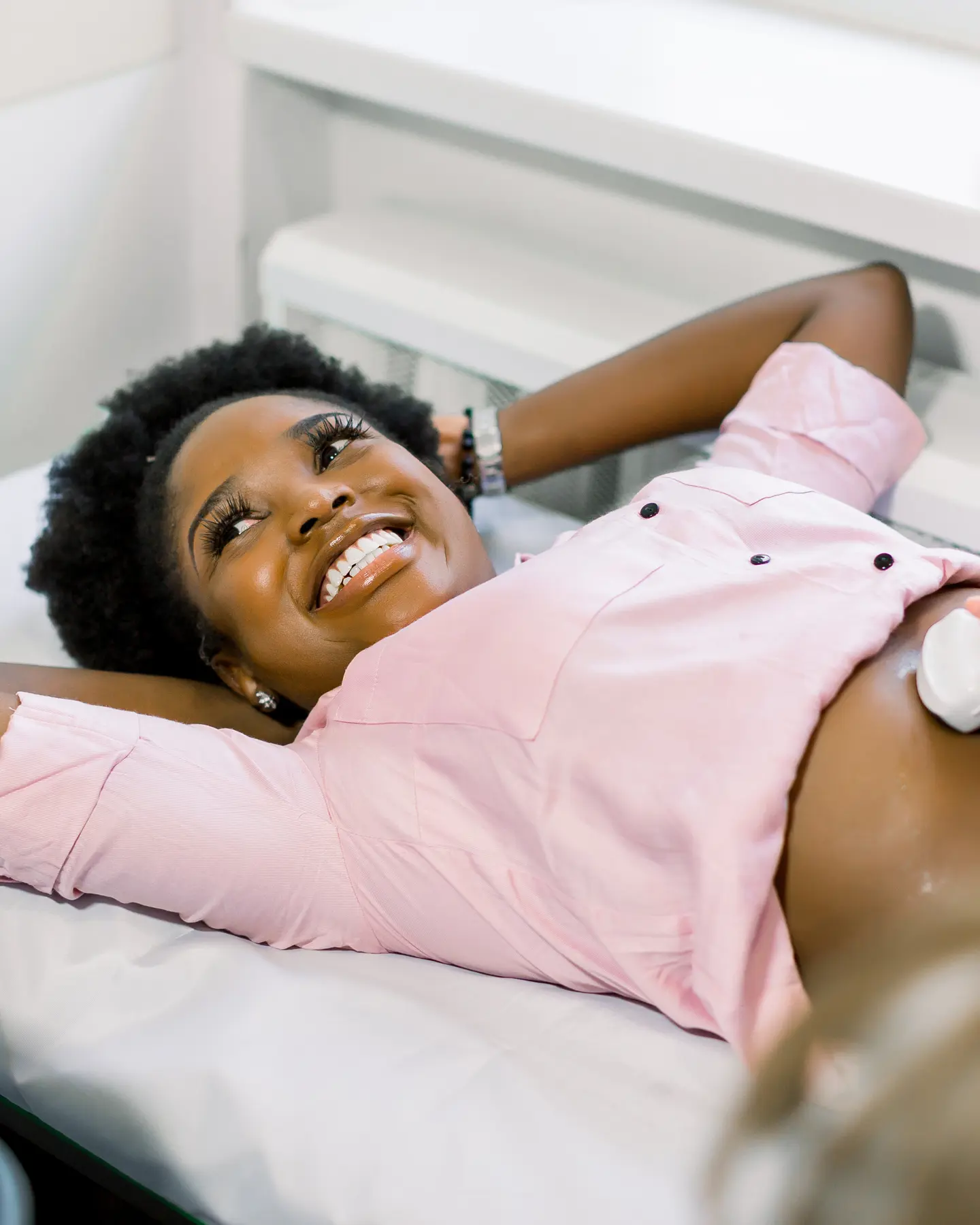 During your scan, the technician or sonographer will use a small, handheld device emitting high-frequency sound waves, which can’t be heard by the human ear. The sound waves bounce off your organs and create echoes which are picked up by the device, sent to a computer and turned into live, moving images which can be recorded and shared with your doctor.